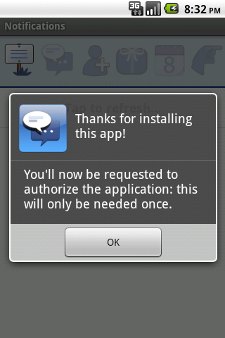 The service can be started automatically at boot if you want, and a 1x1 widget is provided as well to explicitly request new notifications should you want to. A 4x1 widget is also available to show counters of unread notifications. (NOTE: the widgets will NOT work if you move the app to SD). Notifications can be received in the notifications bar and as popup dialogs (by also unlocking and/or waking the screen, if necessary). Details on all the required permissions are at the end of this page.